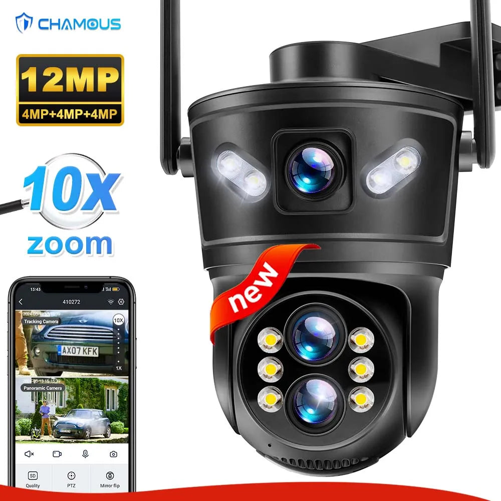 12MP 6K WiFi Camera Outdoor Surveillance 10X Zoom Three Lens Dual Screen Mini Video Cam Auto Tracking Security Protection CCTV