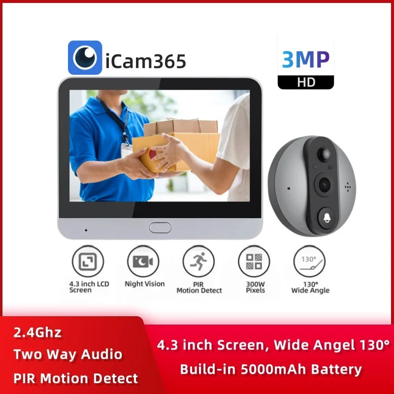 3MP iCam365 Smart Home Security Digital Peephole Video Doorbell 130° Wide Angle 2.4G Wifi Wireless House Door Eye With Camera