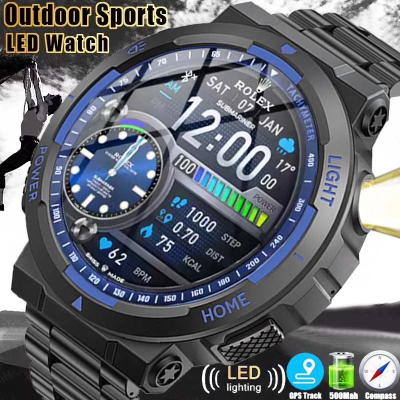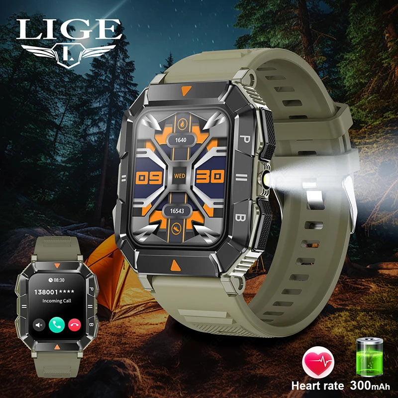 LIGE Rugged Military With LED Flashlight Smart Watch For Men Sports Fitness BT Call Heart Rate Health Monitor Outdoor SmartWatch
